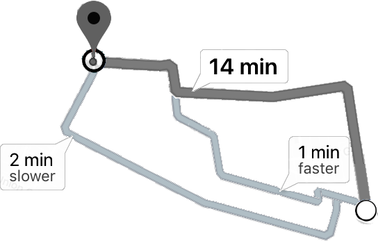 Subsequent design rounds further clarified, simplified and refined the result presentation. Test subjects expressed a desire to see additional information on the map (e.g., bike shops on the route) and in the summary (estimated travel time). These may be addressed in subsequent releases.